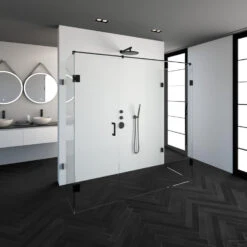 Deze douchecabine is gemaakt van 5 mm dik veiligheidsglas, bevat aluminium mat chrome profielen en heeft sfeervolle zwarte glazen achterpanelen. De douchebak wordt ondersteund door regelbare poten. Deze douchecabine kan zonder silicone geïnstalleerd worden.